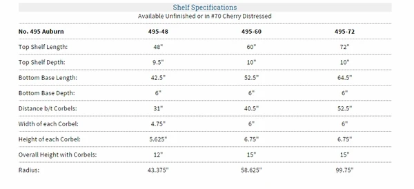 * Please Note: Before ordering this product, please review Pearl Mantels’ Disclaimer/Warranty Statement. Feel free to contact us if you have any questions. *Also Note: Actual finish colors may vary from photos If you love the look and decorative possibilities provided by a mantel, but don’t want your fireplace fully surrounded by a full-sized mantel, the Pearl Mantels Auburn Mantel Shelf – No. 495 may be the perfect solution for your home. Mantel shelves allow you the same showplace for pictures, sculptures, paintings, or other decorative items that a full mantel would, but don’t take up nearly as much space. And all Pearl Mantels mantel shelves are handcrafted to be just both as sturdy and as beautiful as a traditional hearth. The Pearl Mantels Auburn Mantel Shelf – No. 495 is available both finished and unfinished, allowing you the choice of having a beautiful factory finish applied, or applying your own favorite stain or paint to match your home. Whatever you choose, this mantel shelf will make a meaningful and valuable addition to your home. Get the Pearl Mantels Auburn Mantel Shelf – No. 495 today and get started turning the fireplace you have into the fireplace you’ve always wanted.